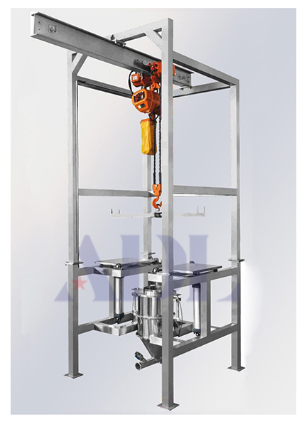 噸包投料站經由過程電動葫蘆將噸袋晉升至設備進料口正上方處,由野生牢固噸袋內袋于設備夾袋口,經由過程