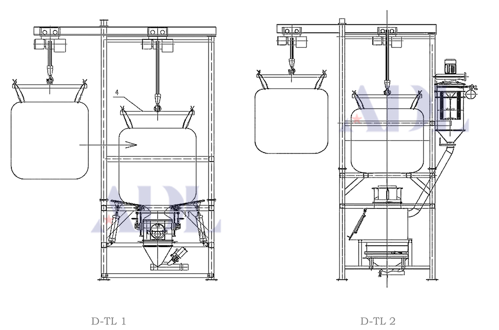 食物、電池資料等行業中、小袋物料和噸袋包裝物料的拆包、投放、篩分和卸料。噸袋拆包時同等于 D-TL